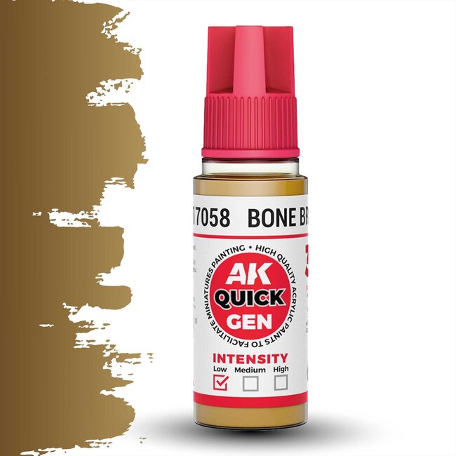 Bone Brown (AK17058) is a warm beige-brown tone within the QUICK GEN range, designed for painters who want to achieve natural, organic and weathered textures. The colour shown in the sample combines a soft light brown with a subtle yellowed bone undertone, making it ideal for skeletal details, aged leather, wood grain and dried natural materials. Miniature painters appreciate how Bone Brown adds immediate warmth and realism without overwhelming the model.