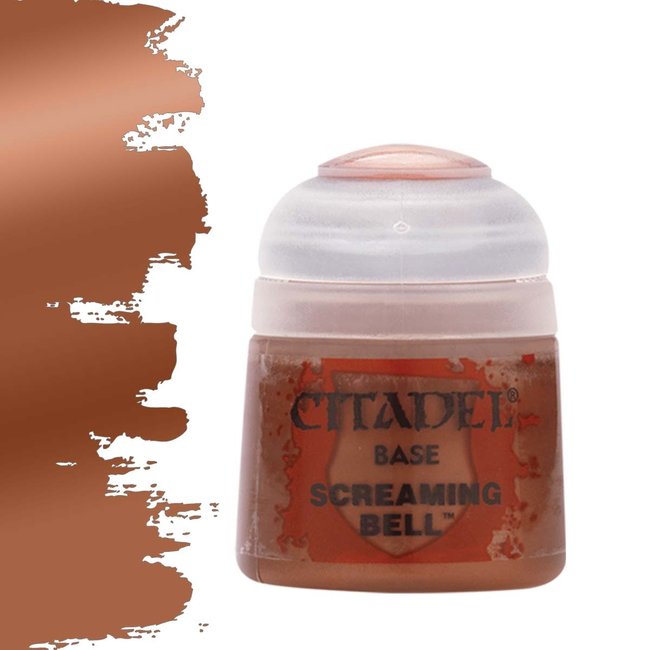 Citadel Screaming Bell Base Paint is designed to give a smooth, solid bronze color over an undercoat and for that reason this will almost always be the first paint you use on a miniature. Shake the bronze paint before using (you can make this easier by adding an agitator ball).