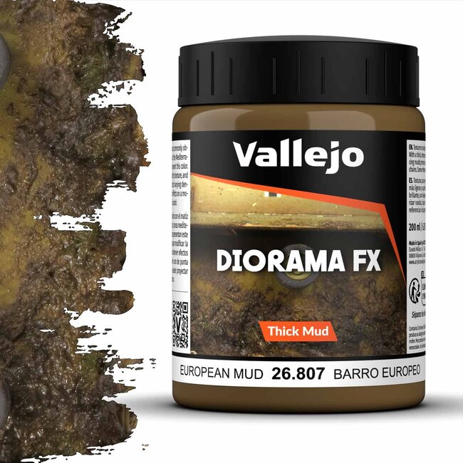 The European Mud (Art. 26807) is a thick texture paste with a dark brown color, ideal for creating muddy terrains in dioramas and vignettes. This mud texture accurately replicates the dark, damp soils commonly found in Central Europe and humid Mediterranean regions. European Mud contains subtle traces of vegetation and is perfect for representing non-alkaline soils, such as those typically seen in forests, meadows, and muddy roads.