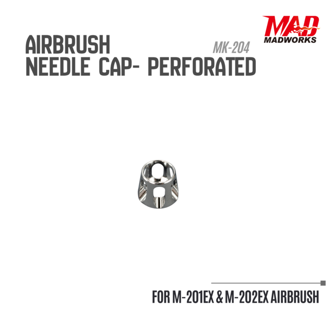 De Madworks Needle Cap Perforated – MK-204 is een functionele upgrade voor de M-201EX en M-202EX airbrushes. Dankzij het geperforeerde ontwerp krijg je beter zicht op de naaldpunt en profiteer je van een stabielere luchtstroom tijdens het spuiten.