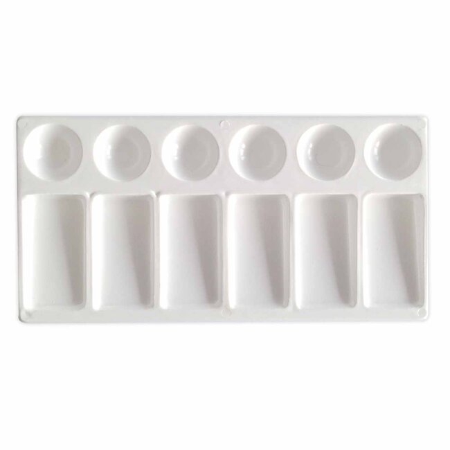 Vang Palet (rechthoekig) 23 x 12 cm gemaakt van hard plastic. Dit palet bevat 12 vakken waarvan 6 ronde en 6 rechthoekige. De rechthoekige vakken lopen schuin af.
