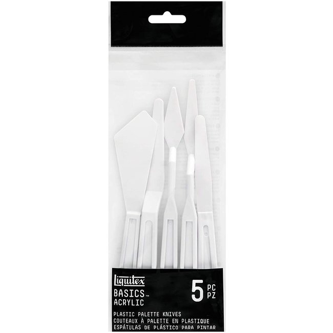 Deze set van 5 paletmessen is van stevig plastic gemaakt in verschillende vormen en maten om te gebruiken met acrylverf. Het kan voor diverse technieken gebruikt worden, zoals bijvoorbeeld volume opbouwen met pasta's, het mixen van kleuren en om direct verf mee aan te brengen op het oppervlak. Reinig de paletmessen direct na gebruik vóórdat de verf opgedroogd is.