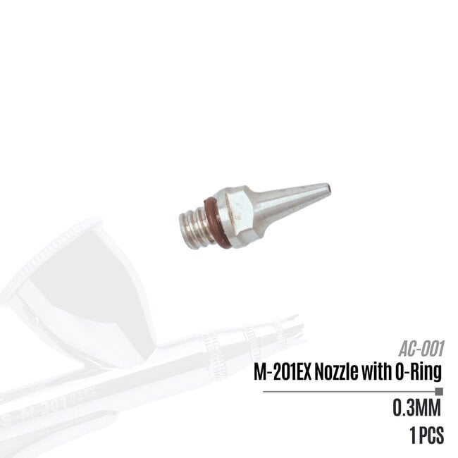 De Replacement Nozzle with O-Ring 0.3 mm – AC-001 is het originele vervangingsonderdeel voor de Madworks M-201EX Double Action Airbrush. Speciaal ontworpen om de prestaties van je 0.3mm airbrush te herstellen of te behouden wanneer de originele nozzle slijtage of beschadiging vertoont.