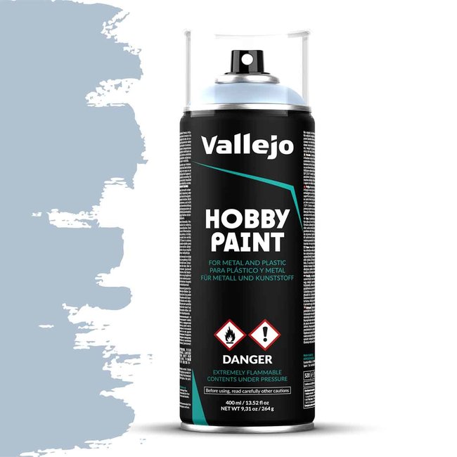 Vallejo Hobby Paint Fantasy Wolf Grey is een 400ml. spuitbus met grijsblauwe grondverf uit de Vallejo Hobby Paint Fantasy serie die mat opdroogt en zelfnivellerend werkt. Het is speciaal ontwikkeld om te hechten op metaal, plastic en resin figuren en modellen. Het fijne pigment helpt de kleinste details te laten zien.